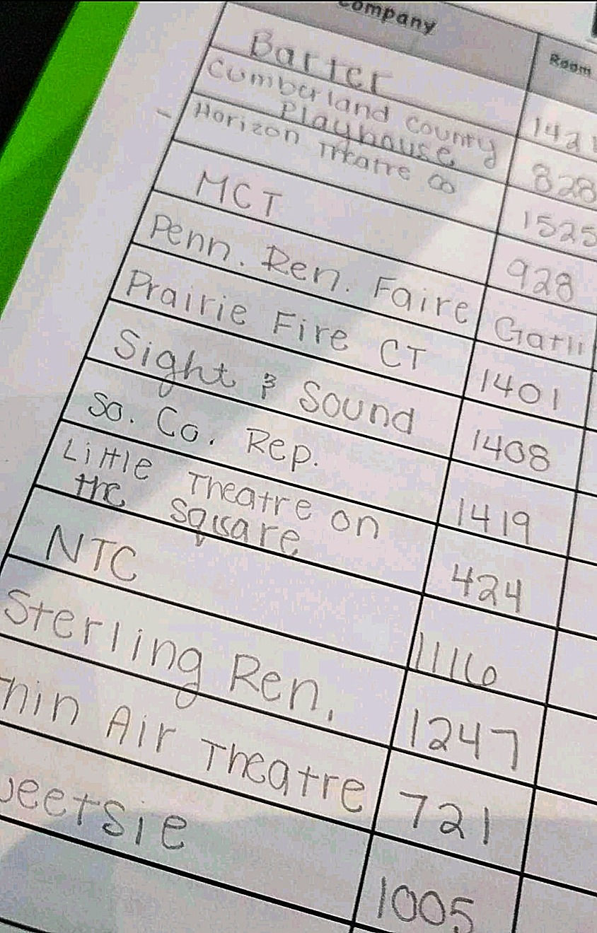 4. Taped along the walls of this ballroom are 8.5x11 sheets of paper printed with the name and room number of each theatre in attendance alphabetically. Under each theatre’s name is the callback paper collected earlier with the name and number of the actors called back for that theatre. Whew--mouthful.